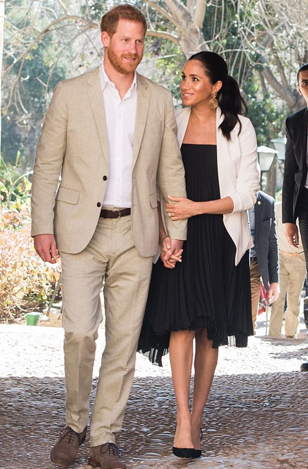 Meghan đặt tay lên lưng chồng khi đến buổi tiếp đón của Cao ủy Anh ở Johannesburg, Nam Phi, hồi tháng 10/2019. Ảnh: EPA.