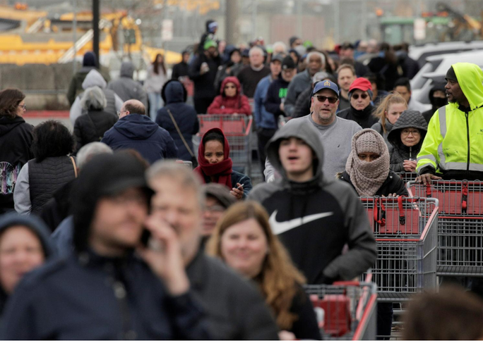Trời vừa hửng sáng ở nước Mỹ ngày 14-3, hàng nghìn người đi mua hàng tích trữ đã xếp hàng dài bên ngoài các siêu thị và cửa hàng bách hóa từ trước giờ mở cửa với hy vọng mua được những nhu yếu phẩm trong bối cảnh đất nước đang hạn chế đi lại để làm chậm tốc độ lây lan virus Sars-CoV-2.