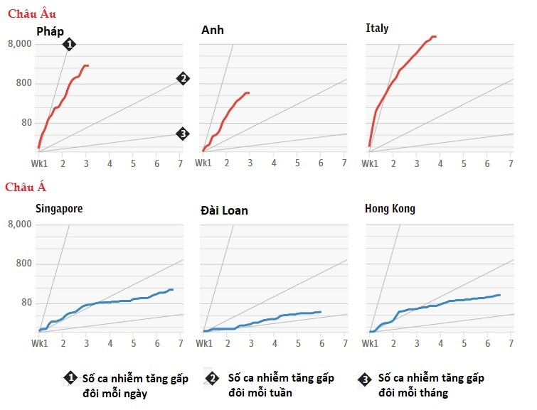 Trong khi sự gia tăng ở các nước Pháp, Anh và Italy là theo cấp số nhân, đường kẻ này ở châu Á là phẳng hơn, cho thấy các biện pháp của chính quyền tại đây đă có hiệu quả.