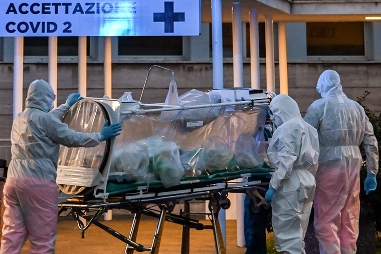 Bệnh nhân được đưa trên cáng bọc kín vào bệnh viện ở Rome, Italy ngày 16/3. Ảnh: AFP/Getty Images