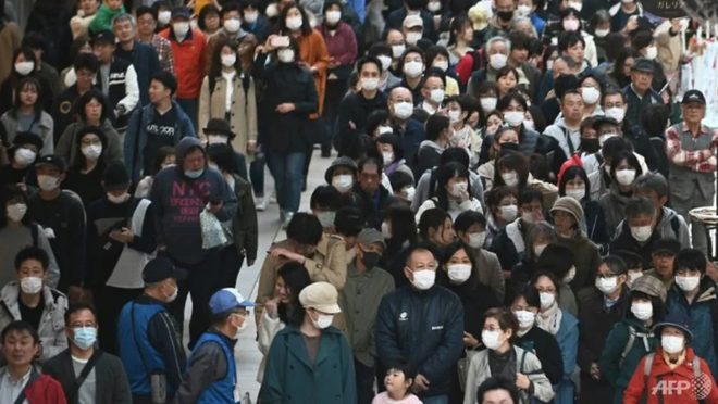 Bức ảnh do AFP chụp cho thấy nhiều người đeo khẩu trang mải mê selfie trước vạc lửa h́nh hoa anh đào.