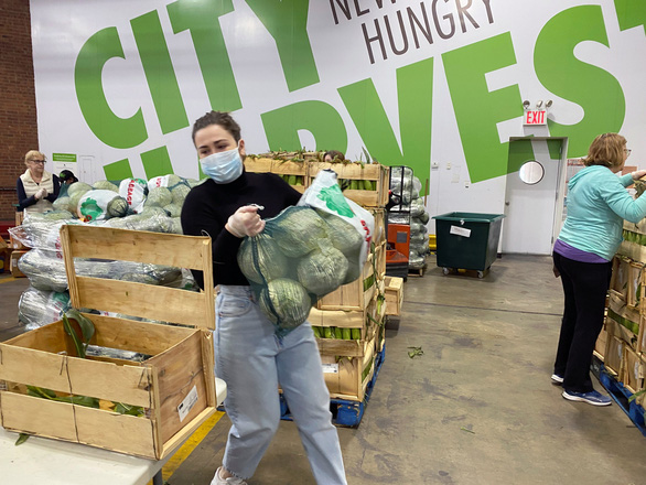 Người t́nh nguyện gói thực phẩm hỗ trợ những người không thể mua được thực phẩm tại New York, Mỹ - Ảnh: REUTERS