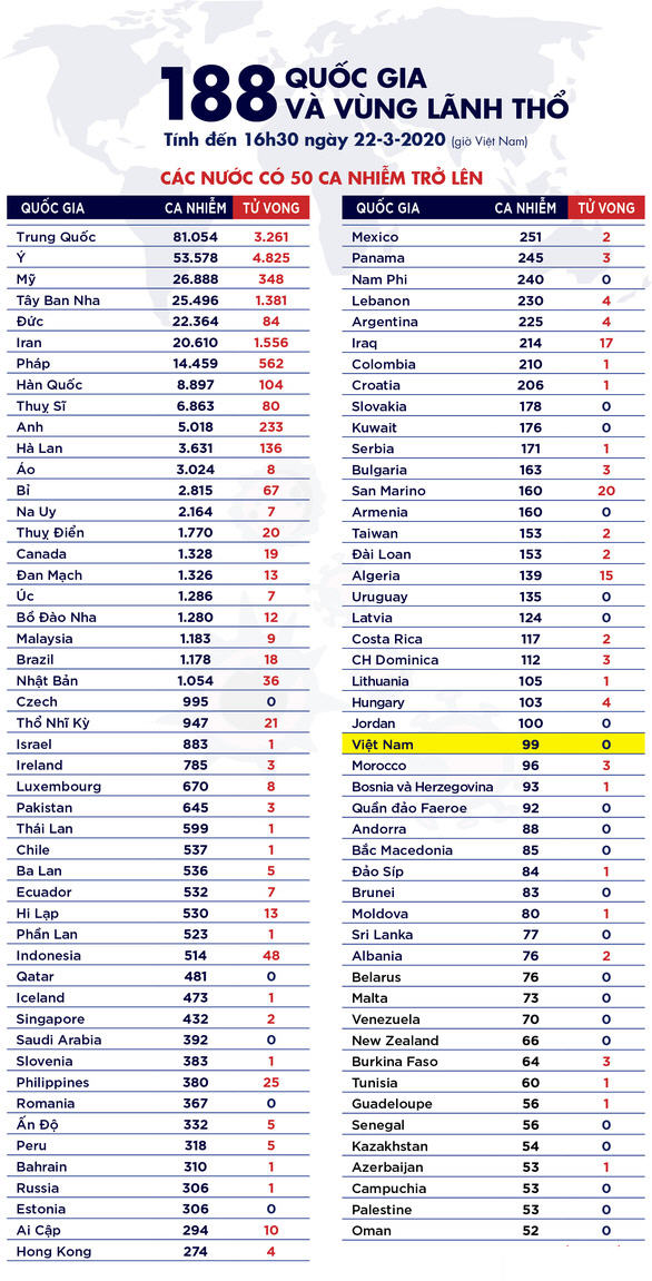 Số ca nhiễm bệnh do virus corona chủng mới (COVID-19) tại Mỹ đă vượt qua mốc 26.000. Như vậy Mỹ đă vượt qua Tây Ban Nha trong danh sách những nước có số trường hợp xác nhận nhiễm COVID-19 cao nhất thế giới vào ngày 22-3, biến nơi đây thành ổ dịch lớn thứ 3 thế giới. Trong khi đó số ca tại Thái Lan tăng sốc, vọt lên 599 ca.
