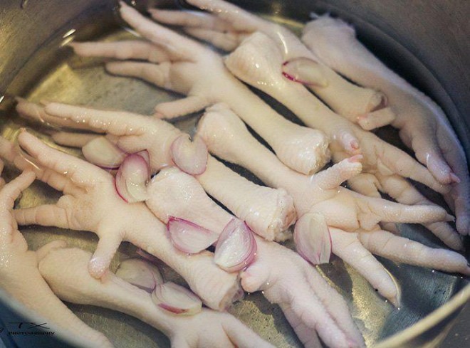 Cho ít hành khô vào luộc cùng chân gà để bớt mùi hôi