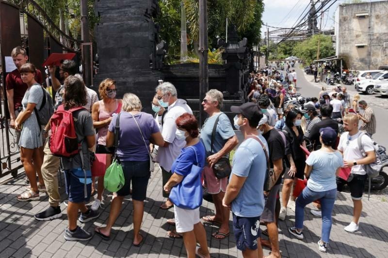 Tại Bali - hòn đảo nổi tiếng với những bãi biển đẹp, ruộng bậc thang và di sản văn hóa của Indonesia, hàng trăm khách nước ngoài đeo khẩu trang, xếp hàng bên ngoài Phòng Quản lý Xuất nhập cảnh Ngurah Rai thuộc vùng Kuta để xin gia hạn thời gian lưu trú.