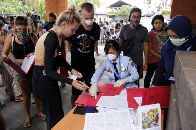 Người nước ngoài xếp hàng ngoài văn phòng quản lý xuất nhập cảnh ở Bali giữa Covid-19. Ảnh: Johannes P. Christo/Reuters.