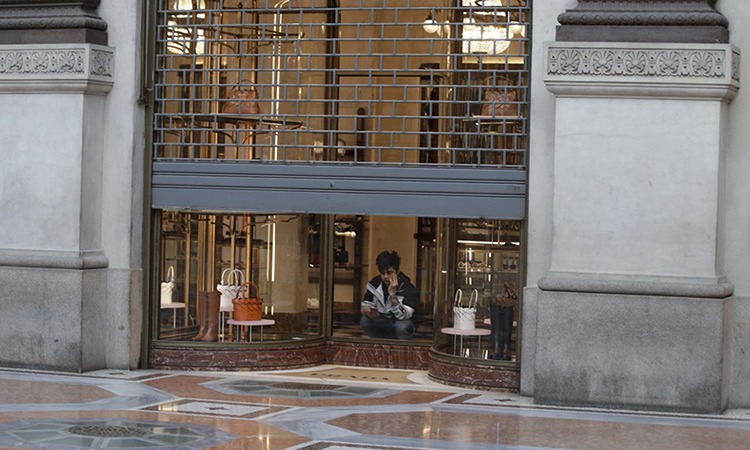 Nhân viên lau dọn ngồi trong một cửa hàng đóng cửa tại khu phố thương mại Vittorio Emanuele ở thành phố Milan, hôm 11/3. Ảnh: AP.