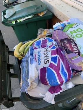 Những chiếc thùng rác chất đầy đồ ăn được tích trữ trong cuộc hoảng loạn mua sắm. Ảnh: Twitter