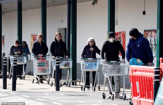 Giám đốc Điều hành hệ thống bán lẻ Tesco, chuỗi siêu thị lớn nhất nước Anh, Dave Lewis, đă viết thư trấn an khách hàng rằng vẫn c̣n nhiều thực phẩm và khuyến khích những khách hàng trẻ tuổi nên đến mua sắm trực tiếp tại các cửa hàng, nhường các đơn đặt hàng trực tuyến cho người già và những người dễ có nguy cơ nhiễm bệnh. Tuy nhiên, động thái này có thể dẫn đến t́nh trạng quá tải người mua sắm tại các siêu thị, dẫn đến rủi ro lây nhiễm cao.