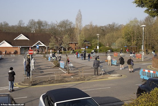 Khách hàng giữ khoảng cách khi xếp hàng bên ngoài siêu thị Tesco tại thị trấn Leatherhead, hạt Surrey (Anh). Ảnh: Daily Mail