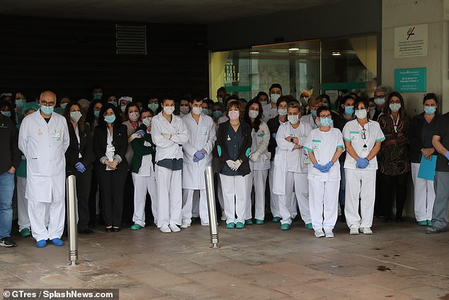Y bác sĩ ở bệnh viện Quiron, Barcelona, dành một phút mặc niệm tưởng nhớ đồng nghiệp mới qua đời vì Covid-19.