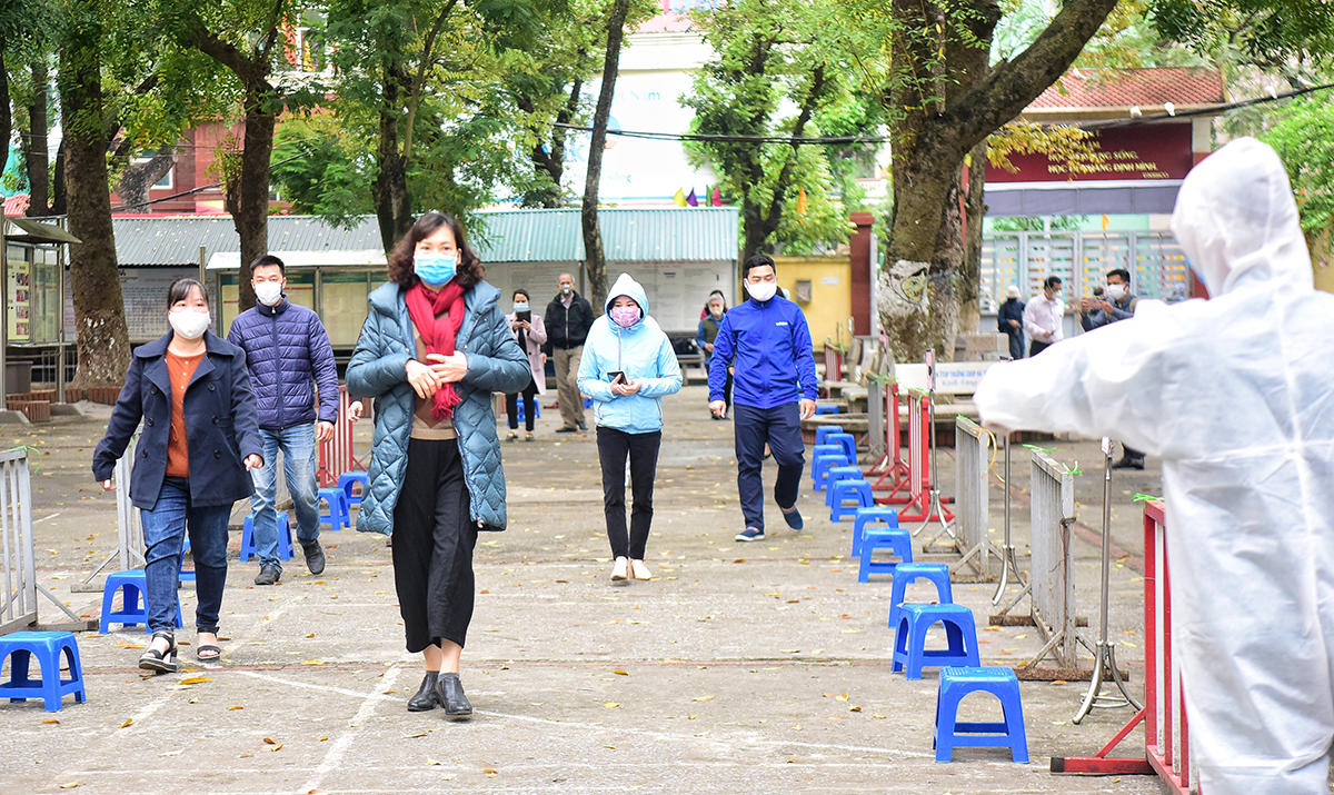 Người dân xếp hàng chờ xét nghiệm ở trường THCS Đống Đa. Ảnh: Giang Huy.