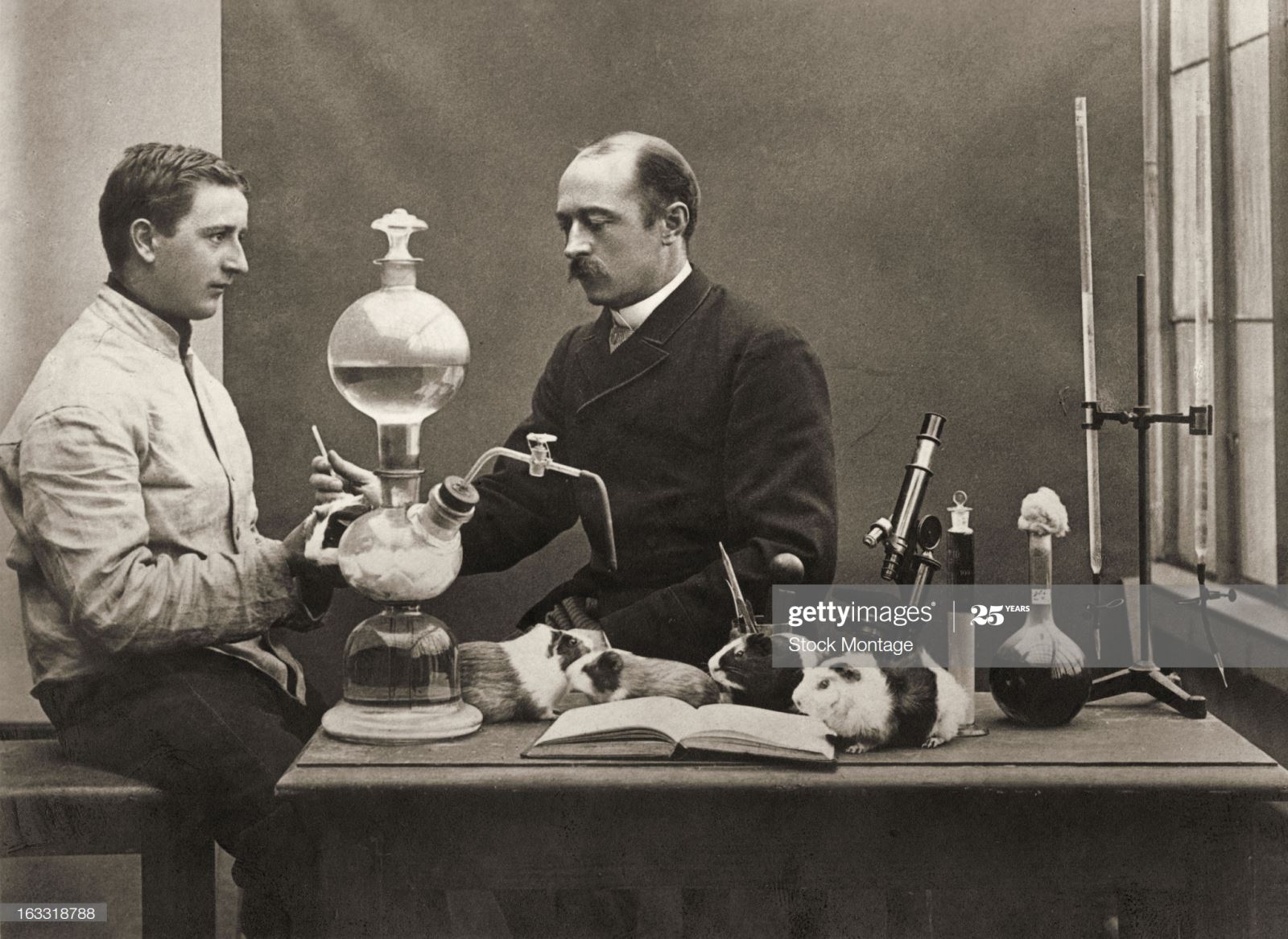 Nhà vi khuẩn học - sinh lý học người Đức Emil Adolf von Behring (phải), từng đoạt giải Nobel, tiêm cho chuột bạch trong phòng thí nghiệm, năm 1890.