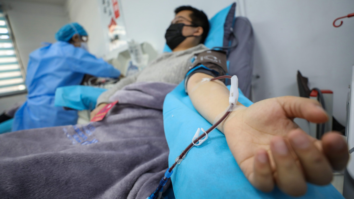 Bác sĩ Kong Yuefeng, một bệnh nhân COVID-19 đã hồi phục, hiến huyết tương ở Vũ Hán, Trung Quốc vào ngày 18/2/2020. Ảnh: Getty Images