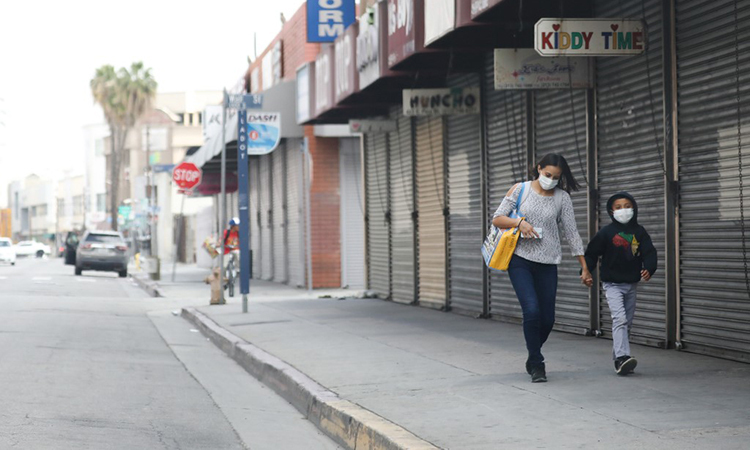 Người phụ nữ và bé trai đeo khẩu trang đi ngang những cửa hàng bị đóng cửa vì Covid-19 tại thành phố Los Angeles, bang California, Mỹ ngày 4/4. Ảnh: AFP.