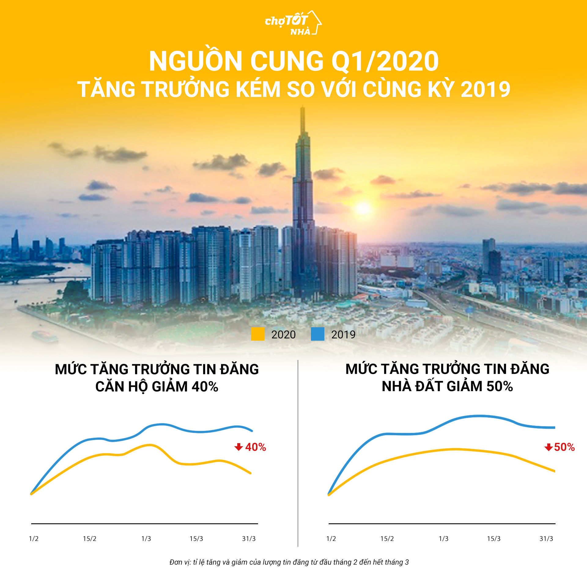 Do dịch bệnh bùng phát khá lâu nên thị trường BĐS ở TP.HCM bắt đầu có dấu hiệu sụt giảm trong nhiều ngày qua. Đây là 1 thực tế không thể tránh khỏi trong thời gian tới. Dưới đây là những thông tin cụ thể. Theo khảo sát về thị trường bất động sản TP.HCM trong Quý I/2020 do chuyên trang Chợ Tốt Nhà thực hiện, mức tăng của cung – cầu giảm sút rõ rệt so với cùng kỳ năm ngoái.