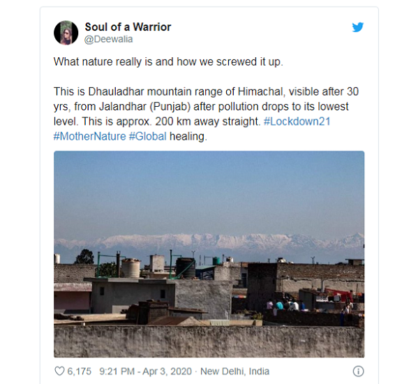 "Suốt 30 năm qua, đây là lần đầu tiên tôi có thể nhìn thấy dãy Himalaya một cách rõ nét khi đứng từ xa như vậy. Tất cả là nhờ các biện pháp cách ly tại nhà trong thời buổi chống Covid. Thật kỳ diệu!". Manjit Kang viết trên tài khoản Twitter của mình.Theo báo cáo của Ủy ban kiểm soát ô nhiễm trung ương Ấn Độ, tại thủ đô Delhi, lượng bụi PM10 trong không khí đã giảm 44% ngay từ ngày đầu tiên thực hiện lệnh giới nghiêm. Cũng theo báo cáo, bầu không khí ở 85 thành phố khác trên toàn quốc cũng được công nhận là sạch hơn sau một tuần cách ly.