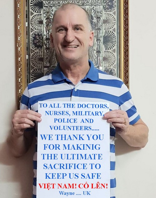 Người nước ngoài ở Hà Nội gửi lời cảm ơn các bác sĩ, y tá, quân nhân, cảnh sát và tình nguyện viên. Ảnh: Wayne Worrell.
