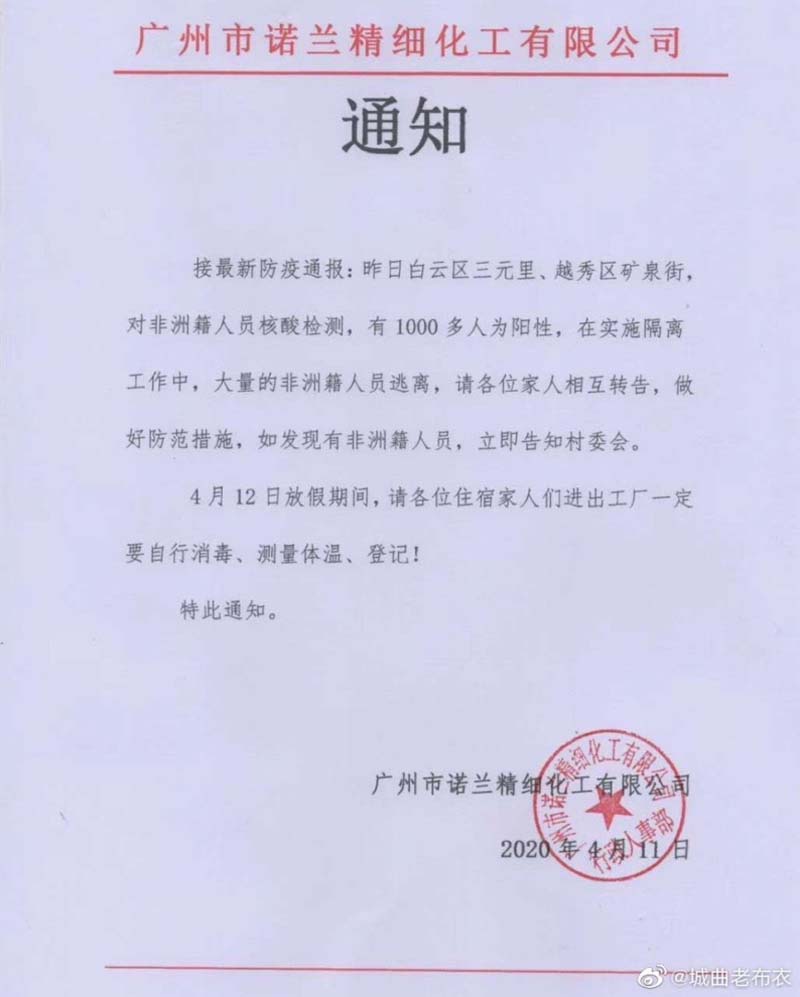 Vào ngày 11/4, trên mạng lan truyền một thông báo nội bộ có đóng dấu của “Phòng nhân sự hành chính của Công ty TNHH hóa chất Nolan Fine, Quảng Châu”. Thông báo cho biết, theo tin phòng chống dịch bệnh (chính thức) mới nhất, vào ngày 10/4, hơn 1.000 người châu Phi ở phố Quáng Tuyền khu Việt Tú; khu phố Tam Nguyên Lý quận Bạch Vân, đã dương tính với virus Corona Vũ Hán và đang được tiến hành cách ly. Trong thời gian này, một lượng lớn người châu Phi cũng đang bỏ trốn.