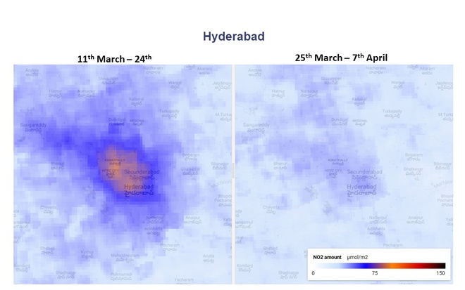 Mức NO2 ở Hyderabad trước và sau phong tỏa. Ảnh: dữ liệu vệ tinh Sentinel-5P.