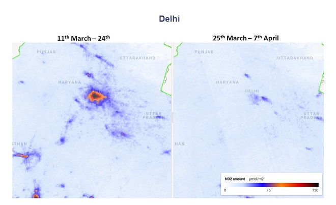 Mức NO2 ở New Delhi trước và sau phong tỏa. Ảnh: dữ liệu vệ tinh Sentinel-5P.