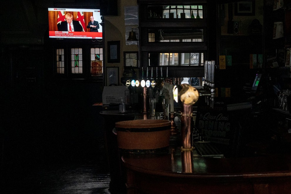 Ông Boris Johnson phát biểu trên truyền hình tại một quán bar vắng người vì dịch Covid-19. Ảnh: EPA