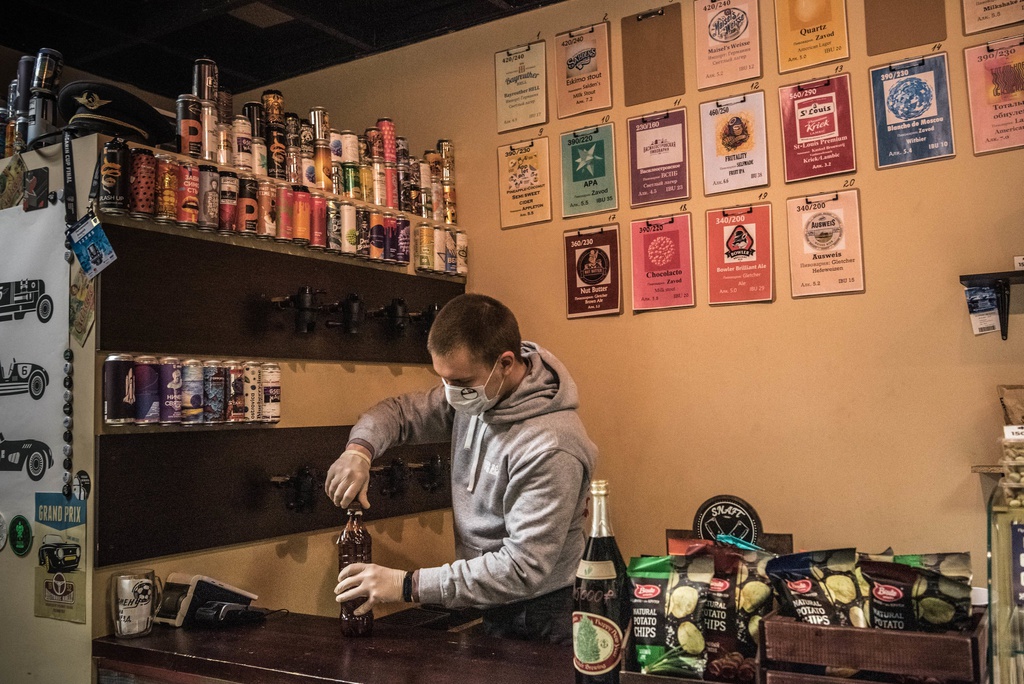 Một người phục vụ quán bar ở Moscow đổ đầy chai bia để bán mang đi. Ảnh: New York Times.