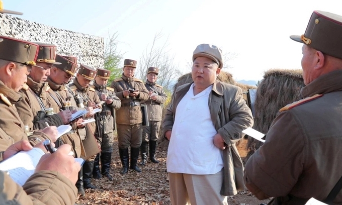 Kim Jong-un giám sát tập trận pháo binh ở Triều Tiên ngày 9/4. Ảnh: KCNA.