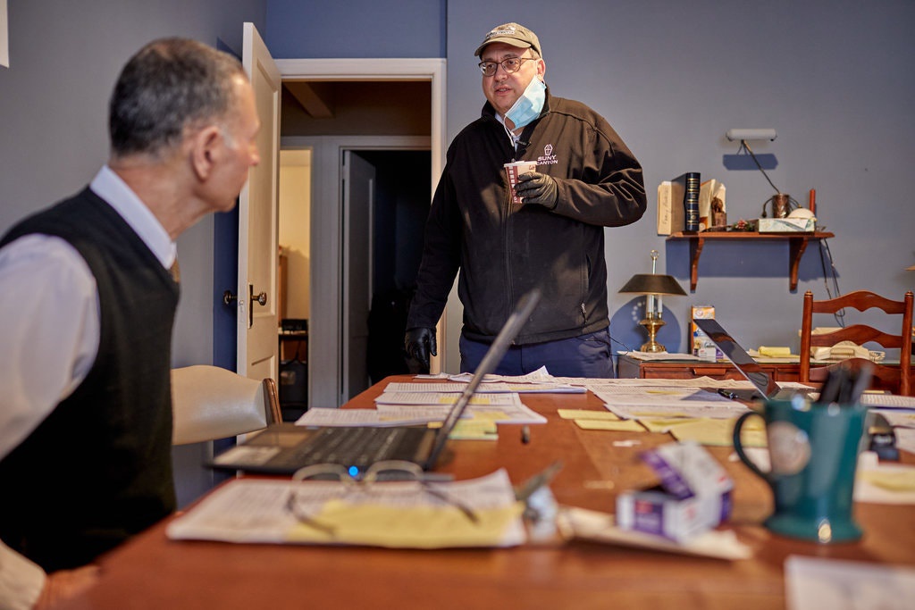 Giáo sư David Penepent (bên phải) trò chuyện cùng nhân viên nhà tang lễ. Ảnh: The New York Times.