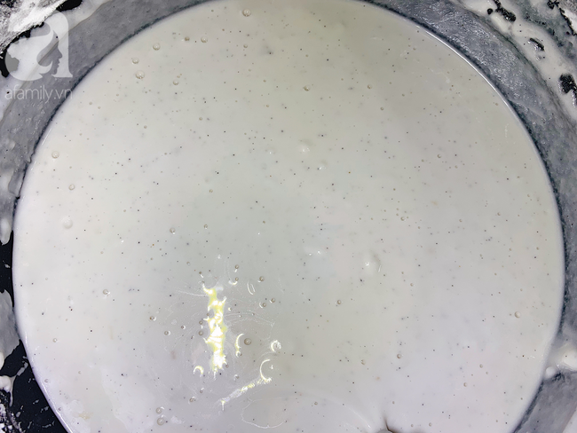 Dùng muỗng để khuấy đều bột trước khi nấu. Nấu bột trên lửa vừa, khuấy liên tục đến khi thấy hỗn hợp bột sôi lục bục và bắt đầu đặc và mịn thì tắt bếp. Nếu phần bột đặc quá, bạn thêm vào 1 chút nước lọc. Phần bột đạt có màu trắng đục, không bị cháy hay vón cục.