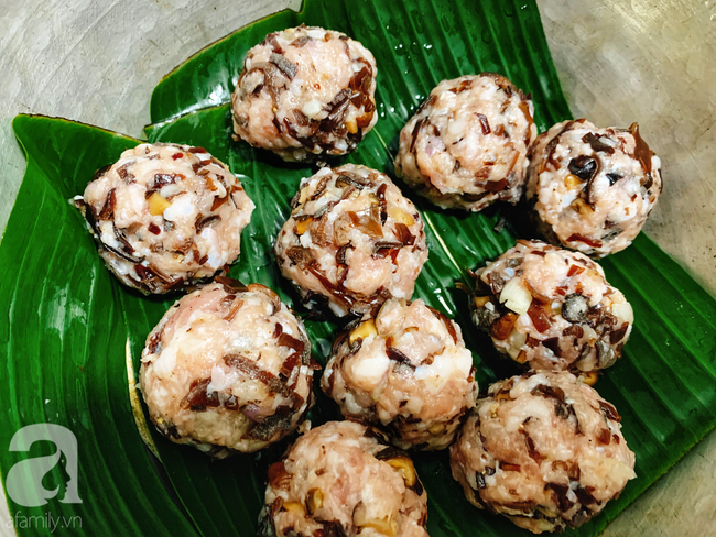 Cho nấm hương + mộc nhĩ + hành khô + thịt + hạt tiêu + 1 thìa cafe nước mắm vào tô, trộn đều tất cả lên. Viên phần nhân thành từng viên tròn, cho trứng cút vào giữa rồi đem hấp chín.