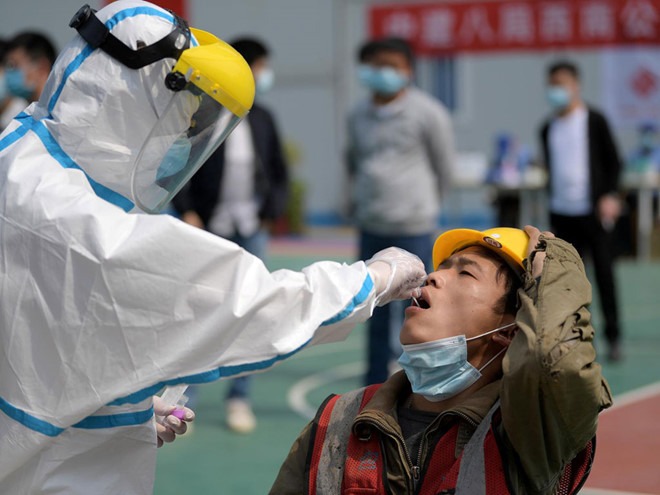 Một công nhân được lấy mẫu xét nghiệm Covid-19 ở Vũ Hán, Trung Quốc