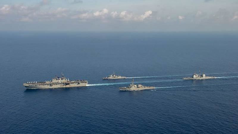 Các tàu Mỹ USS America, USS Bunker Hill và USS Barry cùng chiến hạm Australia HMAS Parramatta di chuyển trên Biển Đông. (Ảnh: Hải quân Mỹ)