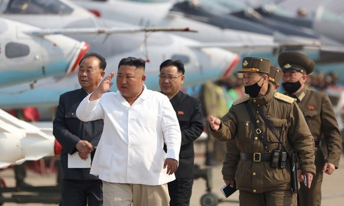 Lãnh đạo Triều Tiên Kim Jong-un (áo trắng) kiểm tra Sư đoàn Phòng không và Không quân ở phía tây Triều Tiên trong bức ảnh được KCNA công bố hôm 12/4. Ảnh: KCNA.