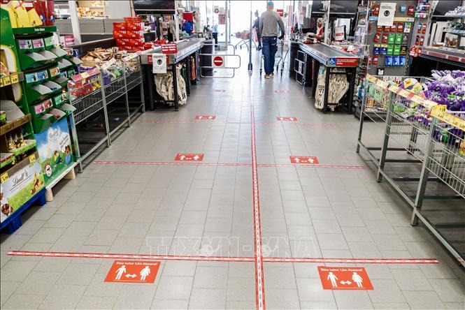 Các ký hiệu và đường kẻ phân chia khoảng cách nhằm thực hiện giãn cách xã hội phòng dịch COVID-19 tại một siêu thị ở Berlin, Đức ngày 9/4/2020.