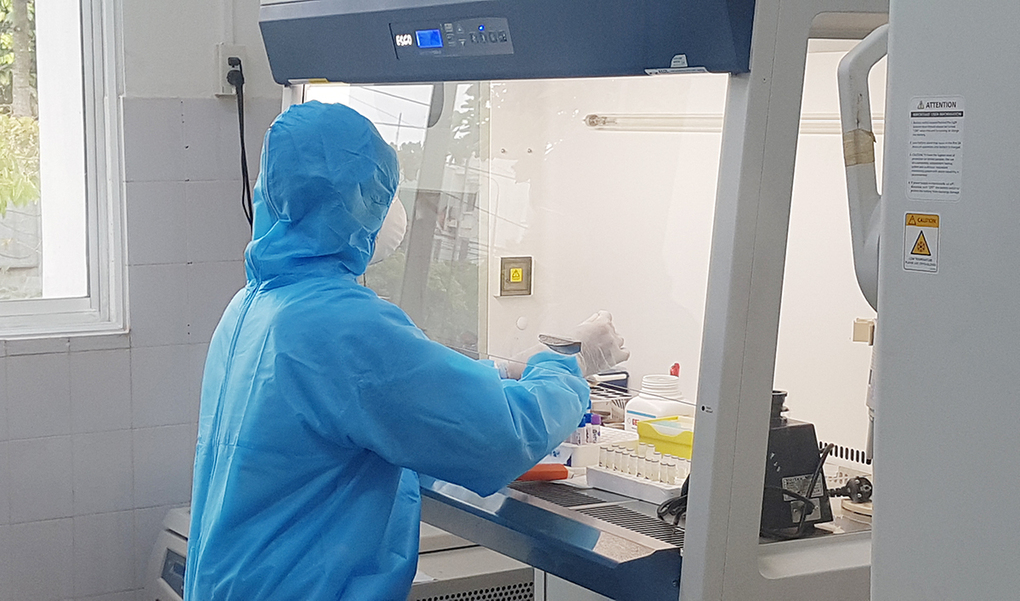 Nhân viên y tế Trung tâm Kiểm soát bệnh tật Quảng Nam làm xét nghiệm mẫu bệnh phẩm. Ảnh: Đắc Thành.