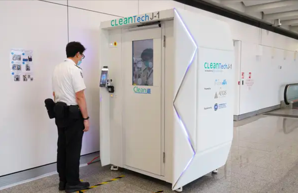 Sân bay quốc tế Hong Kong trở thành sân bay đầu tiên trên thế giới dùng buồng khử trùng toàn thân cho hành khách. Sau khi kiểm tra thân nhiệt, hành khách sẽ bước vào những chiếc máy này và hoàn tất chỉ trong 40 giây.