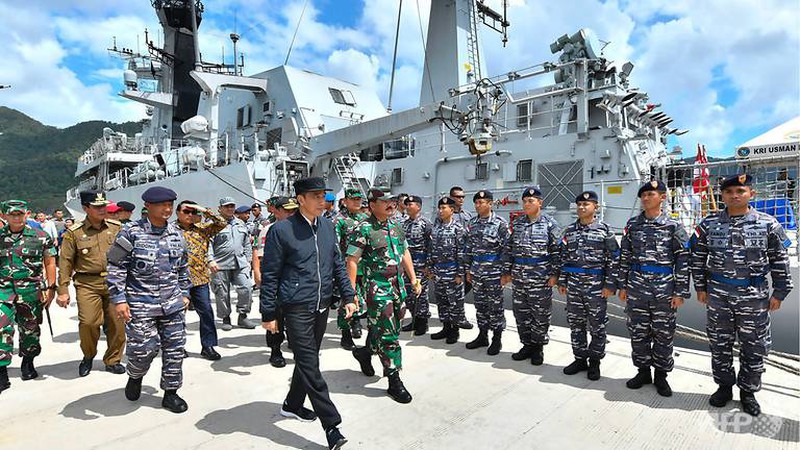 Tổng thống Indonesia Joko Widodo (áo đen) thăm một căn cứ quân sự ở quần đảo Natuna – giáp với Biển Đông - hồi tháng 1. Indonesia cũng có nhiều căng thẳng với Trung Quốc ở khu vực này. Ảnh: AFP