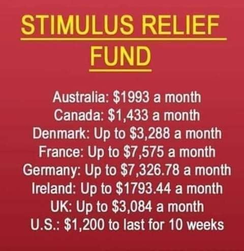 $2000 mỗi tháng thì gần tương đương với chương trình mà Canada đã áp dụng cho người Dân từ tháng 3 đến nay và tiếp tục. Riêng tỉnh bang Ontario Canada thì mỗi người $2000 của liên bang và $1000 của tỉnh bang, vợ hay chồng đều lãnh bằng nhau. Riêng con cái mỗi trẻ $500. Tóm lại, hai vợ chồng và 2 con =$7,000. Ngu sao biểu tình đòi đi làm ?!!