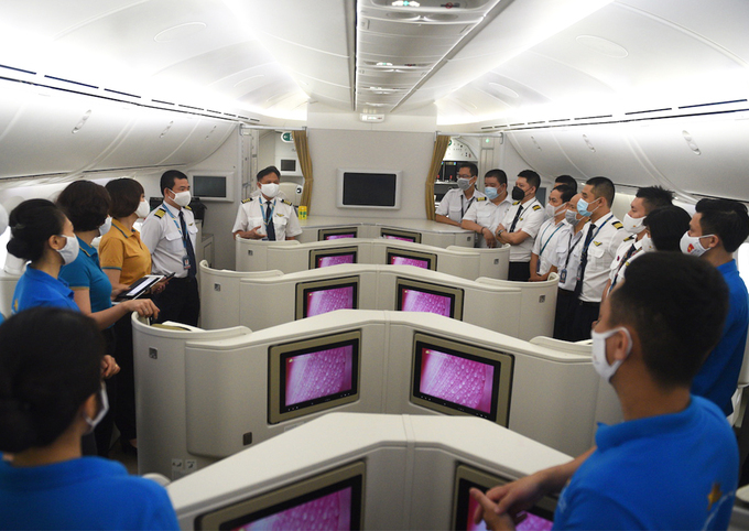Phi hành đoàn họp trên máy bay trước giờ khởi hành. Ảnh: NVCC.