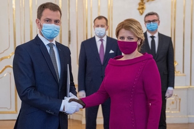 Tổng thống Slovakia Zuzana Caputova (phải) tại lễ tuyên thệ nhậm chức của chính phủ mới ở Bratislava hồi tháng ba. Ảnh: Reuters.