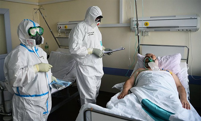 Nhân viên y tế chăm sóc cho một bệnh nhân nhiễm nCoV tại Viện nghiên cứu Phẫu thuật Quốc gia A.V. Vishnevsky ở Moskva, Nga, ngày 8/5. Ảnh: RIA Novosti.