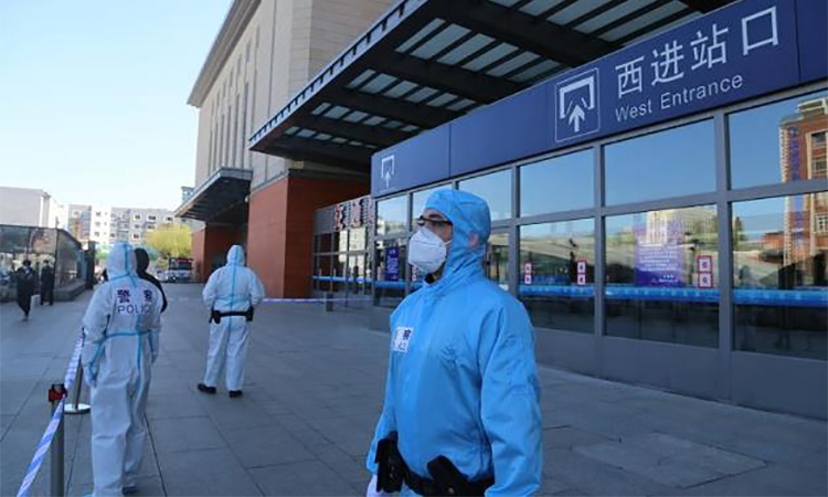 Cảnh sát mặc trang phục bảo hộ đứng gác trước cửa ga tàu ở thành phố Cát Lâm, Trung Quốc ngày 13/5. Ảnh: CCTV.