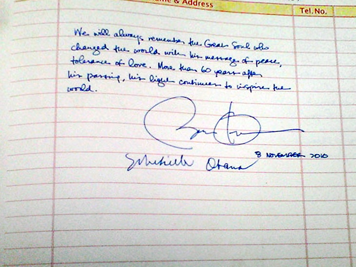 Trong khi đó, vào năm 2010 ở trong 1 cuốn lưu niệm tại một ngôi đền khác tên Mani Bhavan tại TP Munmbai, cũng tưởng niệm Mahatma Ganhdi , đây là những gì TT Barrack Obama đã viết khi thăm viếng: