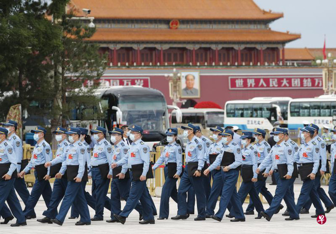 Các đại biểu thuộc đoàn Quân giải phóng và Cảnh sát vũ trang di chuyển đến Đại lễ đường nhân dân Bắc Kinh để tham dự các phiên họp trong khuôn khổ Lưỡng hội 2020, gồm kỳ họp của Quốc hội và Chính hiệp toàn quốc Trung Quốc (Ảnh: Chinanews)