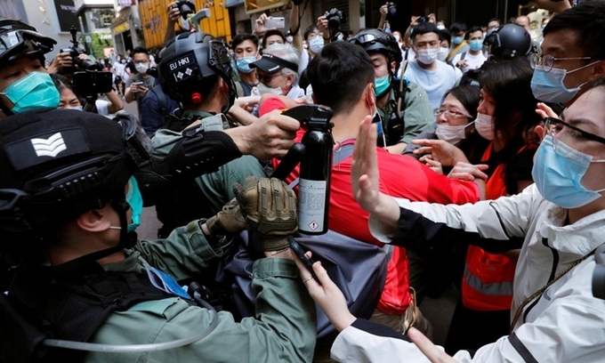 Cảnh sát đụng độ người biểu tình ở Hong Kong, ngày 27/5. Ảnh: Reuters.