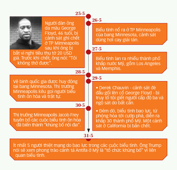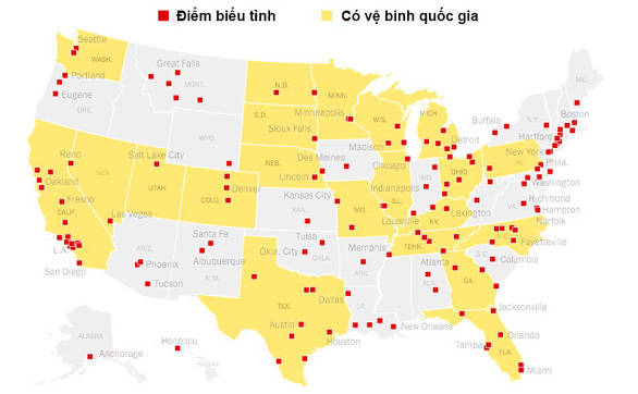 Ít nhất có 21 tiểu bang phải huy động lực lượng Vệ binh quốc gia thiết lập trật tự, từ khi có các cuộc biểu tình phản đối sau cái chết của người đàn ông da màu George Floyd đã bùng lên tại ít nhất 140 thành phố trên toàn nước Mỹ.
