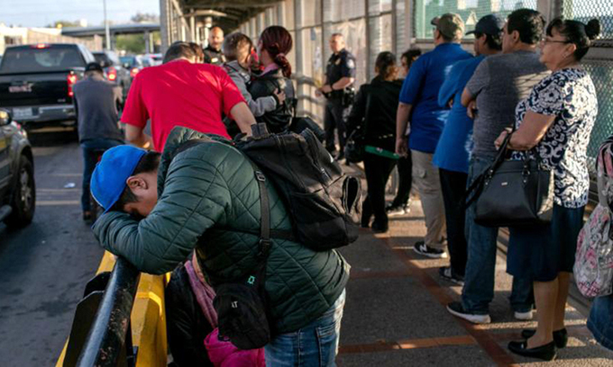 Một người Mexico gục đầu trong lúc chờ đợi xin tị nạn cùng gia đình trên cây cầu quốc tế nối Mexico với Mỹ tháng 12/2019. Ảnh: AFP.