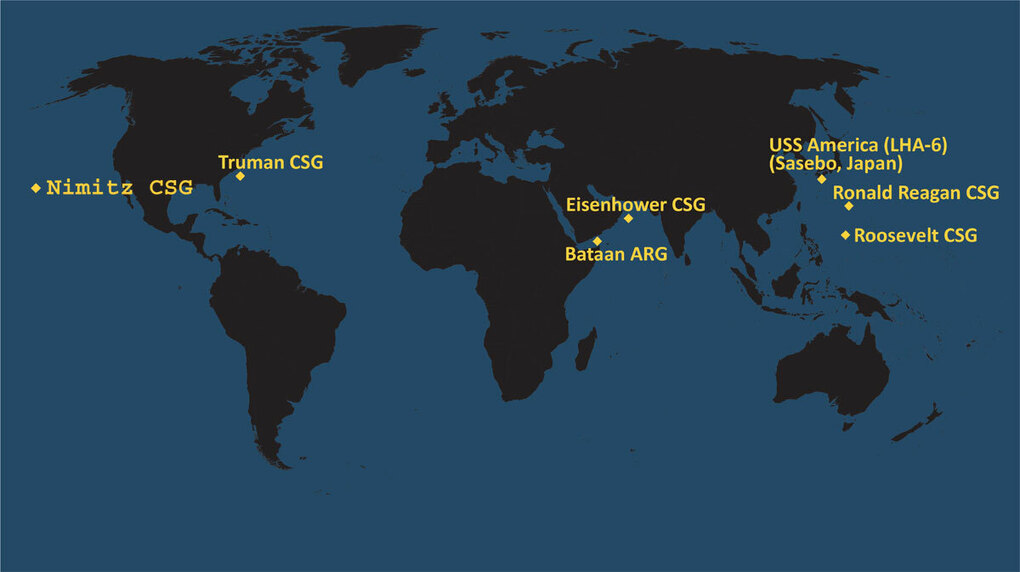 Ba nhóm tàu sân bay này đang được phân bố đều trên Thái Bình Dương. Nhóm tàu USS Theodore Roosevelt hoạt động ở phía đông và đông bắc Biển Philippine, giữa đảo Guam và Philippines. USS Ronald Reagan và lực lượng hộ tống cũng hiện diện ở Biển Philippine, khu vực phía nam Nhật Bản. Trong khi đó, nhóm tàu USS Nimitz đang ở ngoài khơi bờ biển phía tây nước Mỹ và hướng về Tây Thái Bình Dương.