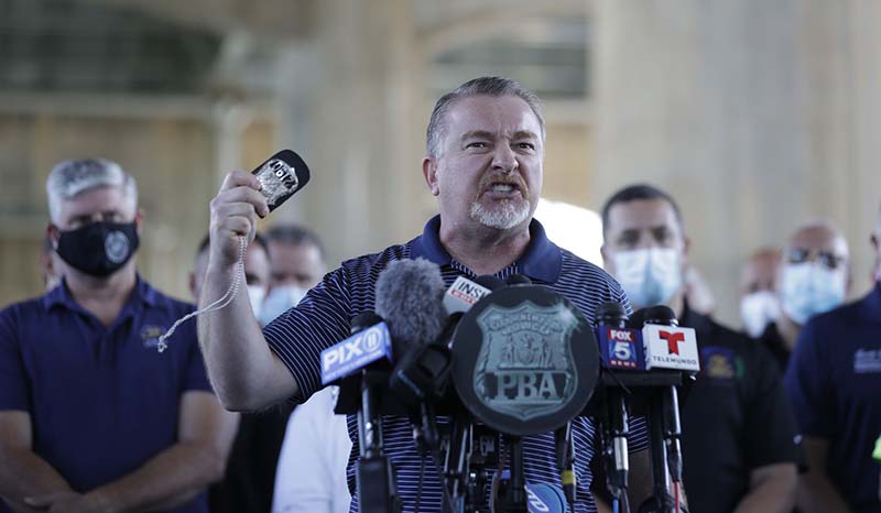 Chủ tịch Liên minh Phúc lợi Cảnh sát New York (PBA) là Mike O’Meara, đã tổ chức một cuộc họp báo nhằm đáp trả cánh truyền thông và các nhà lập pháp tiểu bang. (Ảnh qua Twitter)